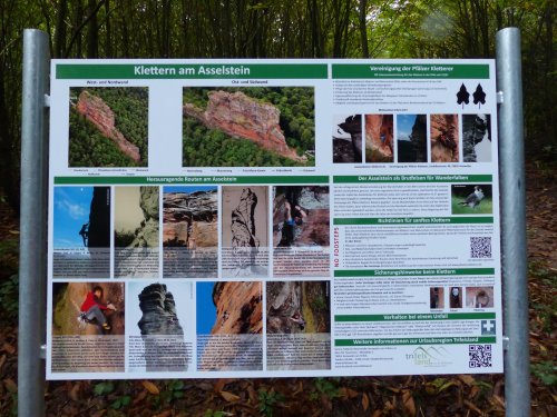 Die Tafel ist aufgeteilt in 2 Bereiche: Eine Beschreibung des Asselstein mit seinen markantesten Anstiegen und ein allgemeiner Teil mit Informationen zum Klettern in der Pfalz. Koordiniert und erstellt wurde das Schild durch unseren Pressereferenten und den Felswart, unterstützt durch die anderen Vorstandsmitglieder.